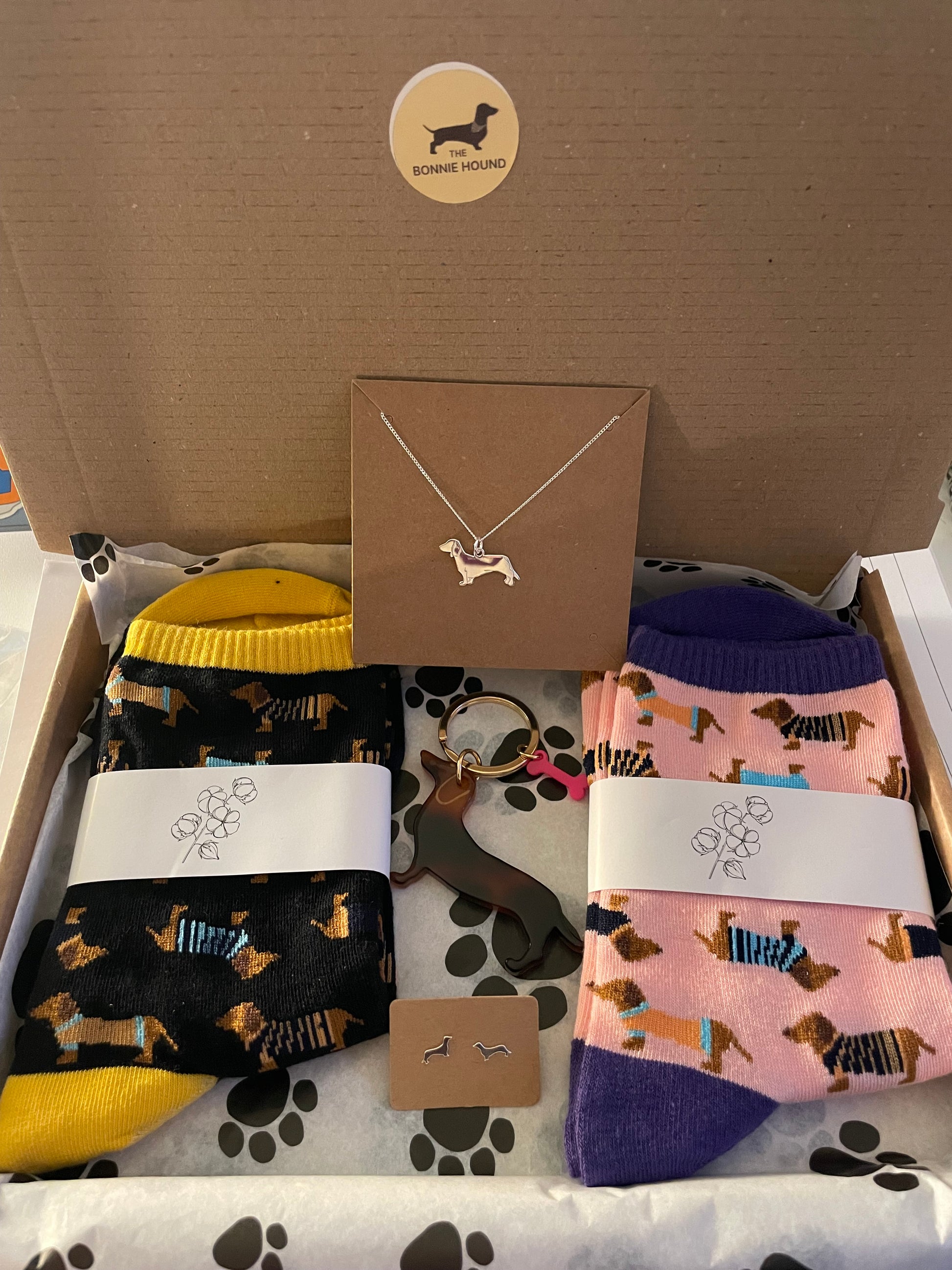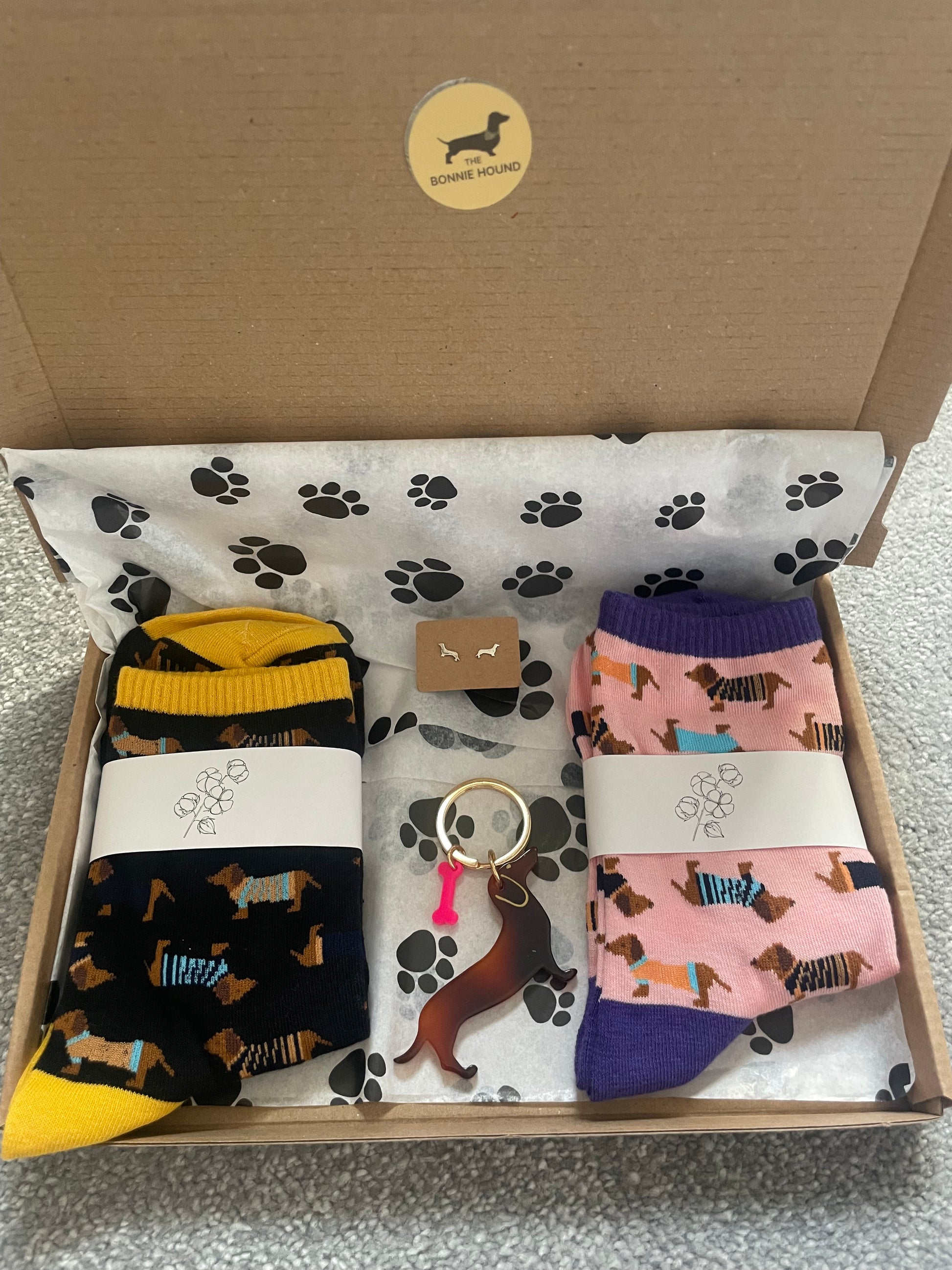 The box comes with 2 x pairs of socks (colours vary) and a keyring. you can add on paw earrings, dachshund earrings, dachshund necklace and a bracelet.
