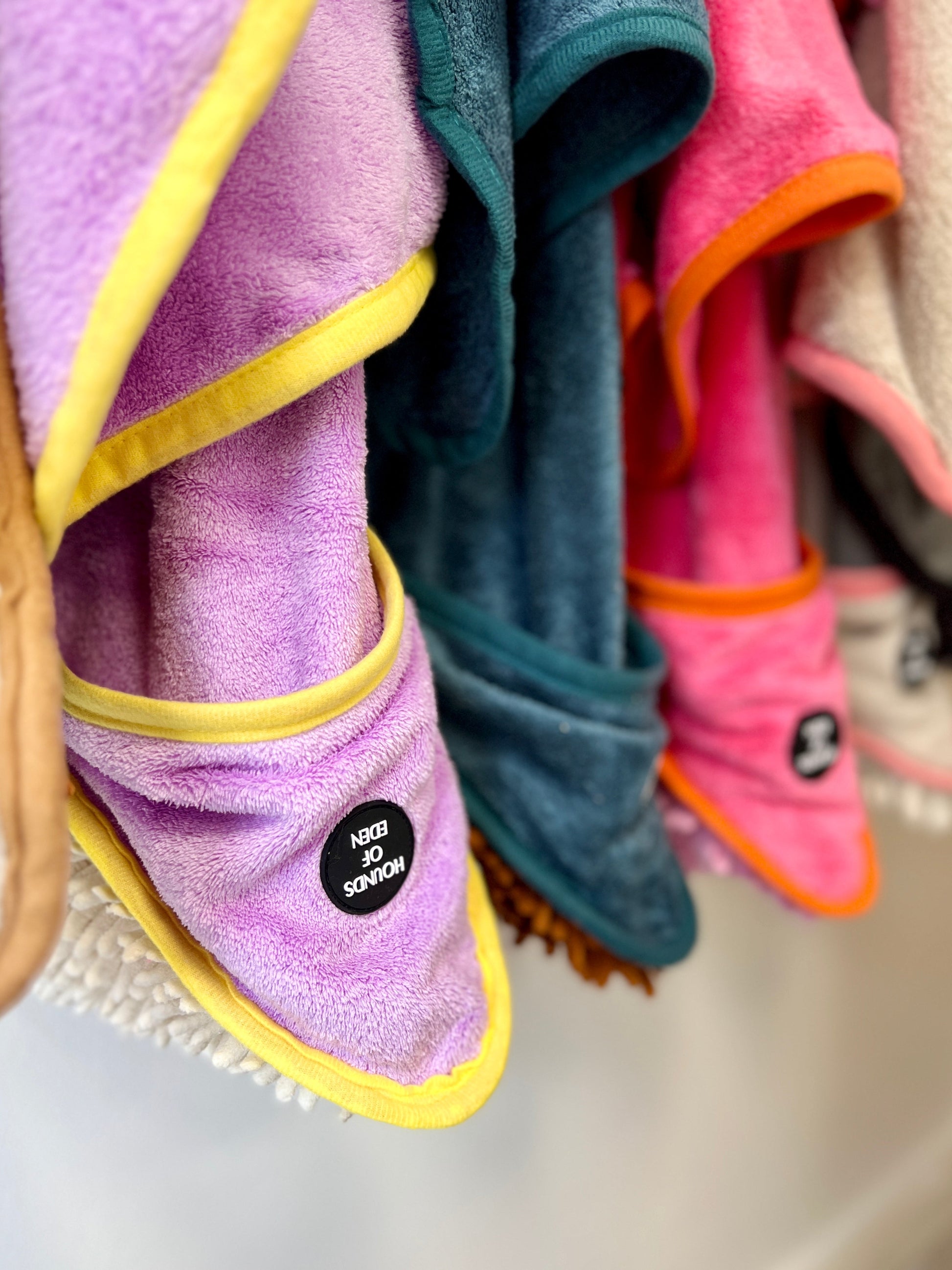 We can add these, so the towel stays on your pup more easily if you wish, creating a drying cape/robe. Please note, due to the size of the towel, we recommend this only for medium to larger breeds where the 105cm length of towel is accommodated with ease.