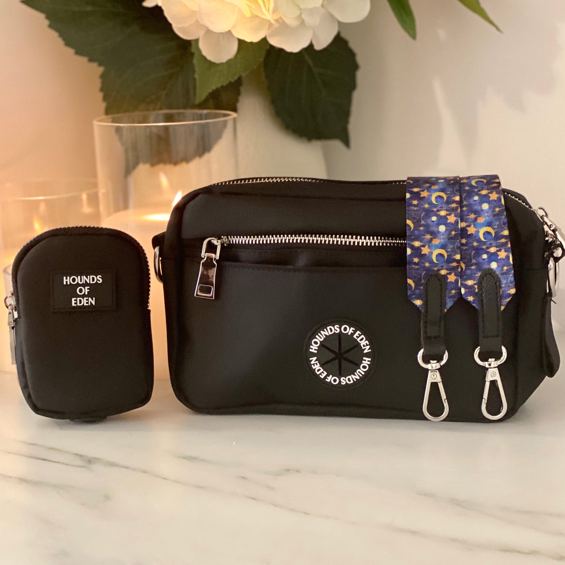 - Comfortable wide fully adjustable shoulder strap with faux leather detailing, silver or gold hardware & D-ring for clipping small matching treat & poop bag pouch to.