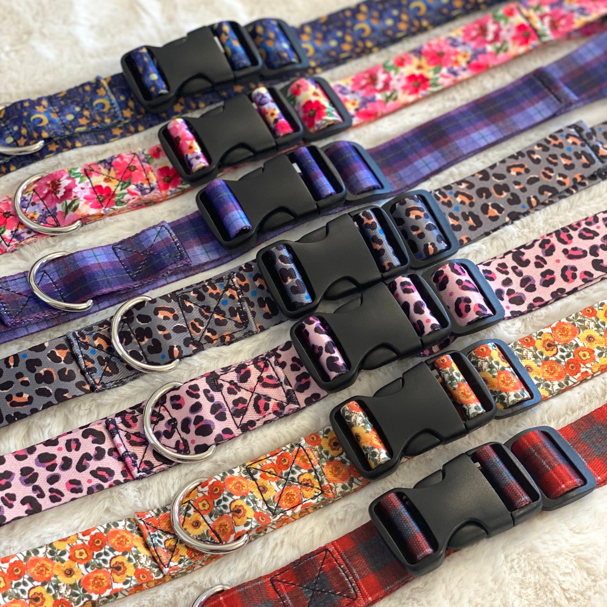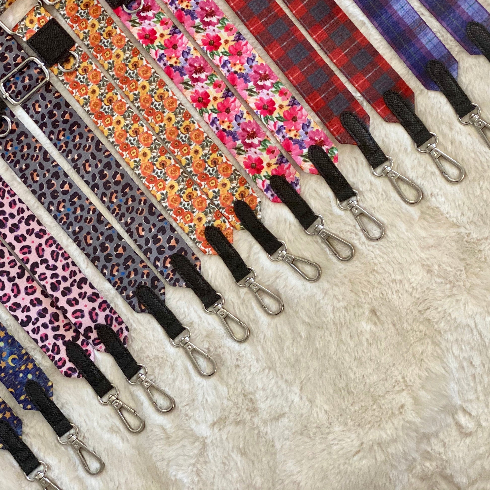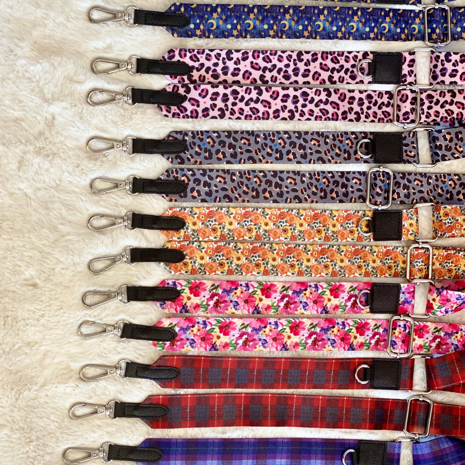 - Comfortable wide fully adjustable shoulder strap with faux leather detailing, silver or gold hardware & D-ring for clipping small matching treat & poop bag pouch to.