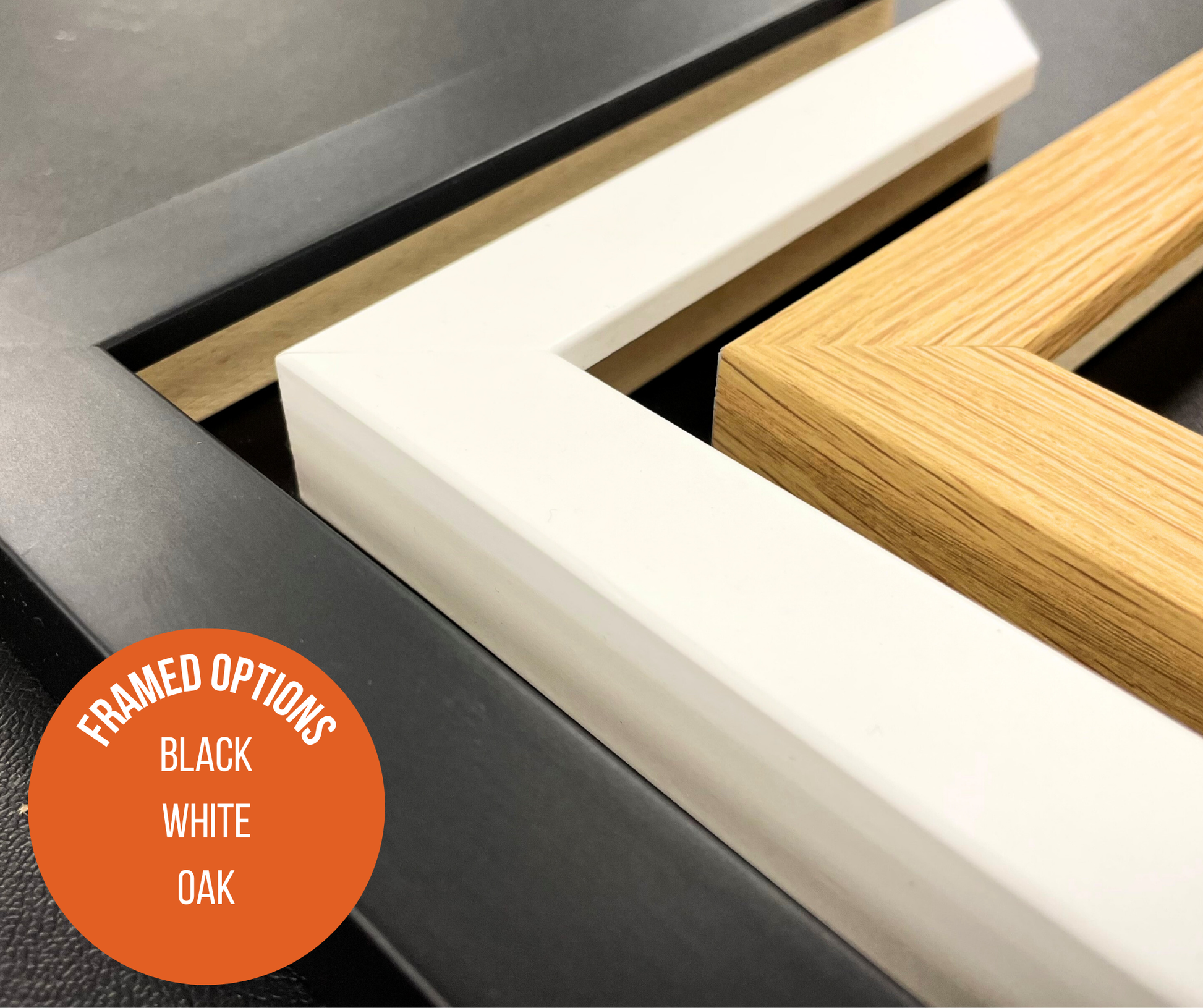 Choose between black, white, oak or no frame. The dimensions listed don't include the frame. The width of the frames are 25mm / 1 inch. Frames are FSC certified.